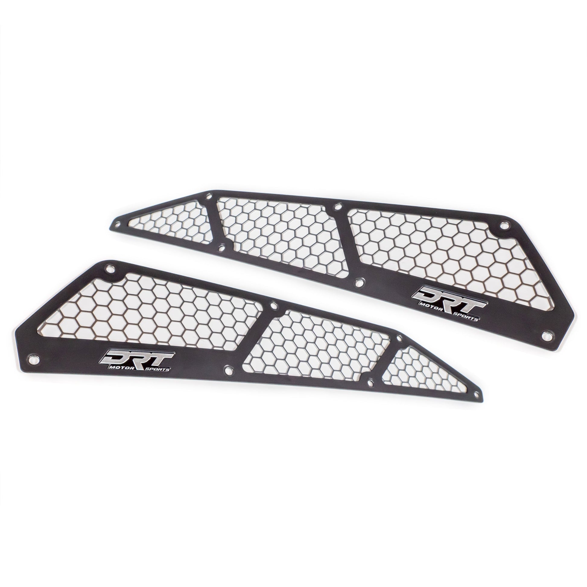 This multilayer laser cut intake vent cover set includes a top plate finished in a black powder coat and a contrasting bright anodized mesh back plate. The kit includes DRT Motorsports Aluminum badges to complete the look.
