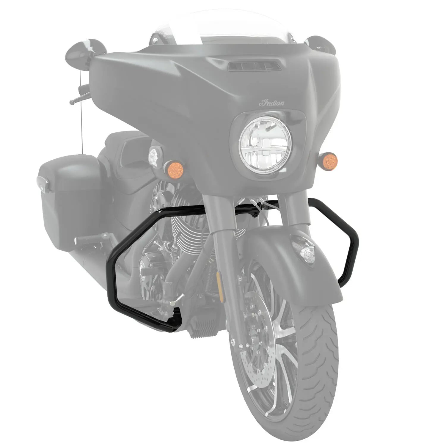 With these Highway Bar installed, an Indian Motorcycle® rider can add a set of Hard Lower Fairings (sold separately) that offer front-end airflow control and provide convenient cargo space. These Mustache Highway Bar bolts onto the motorcycle frame and provides reliable tip over protection.