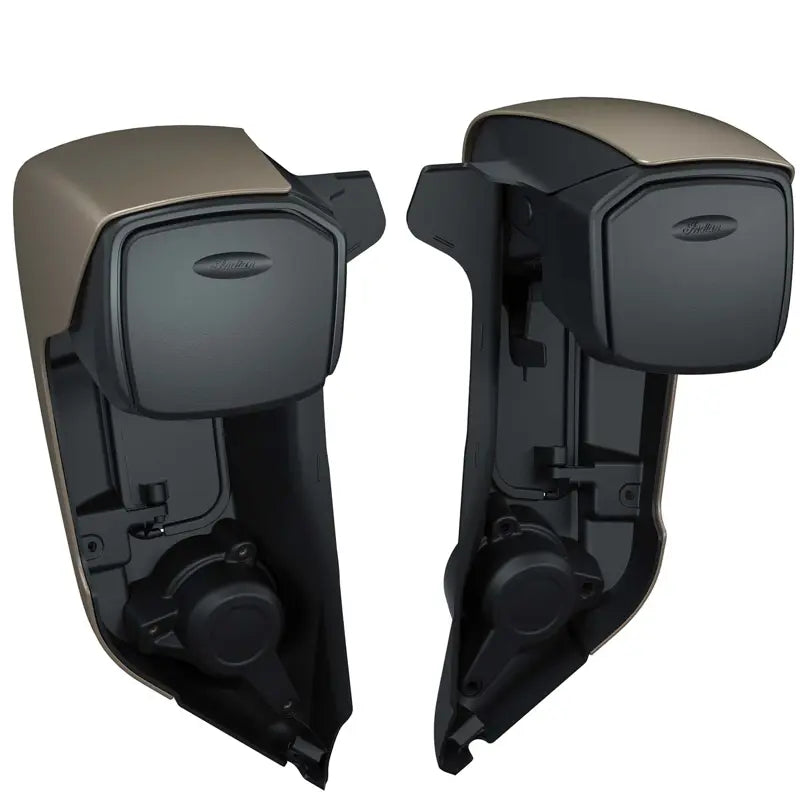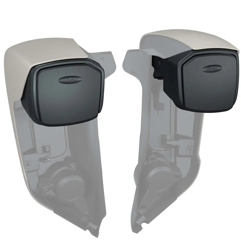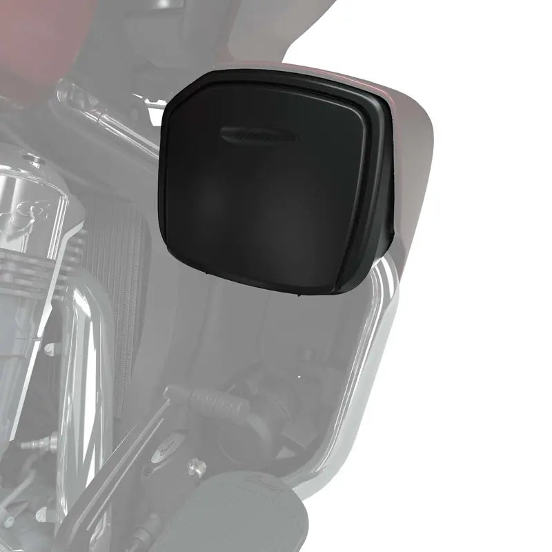 These injected-molded storage bins with hinged lids install in the upper area of the Hard Lower Fairings (PN 2889475; sold separately). The lids are hinged on bottom to open with optimal access to storage space. Each lid has a spring-loaded, dampened pivot for easy one-hand opening and closing to prevent the lid from slamming down. Each storage bin has a rubber base for cargo protection, and a small lip at the bin opening keeps small objects from falling out when the cover is open or if the bike is parked in an uphill position. Includes left- and right-hand storage bins.