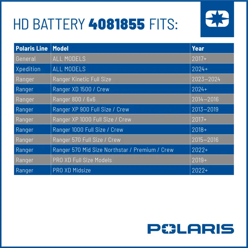 This HD Battery is AGM and fully sealed for optimal starting power with maximum reserve capacity, designed for highly accessorized vehicles and extreme operating conditions. Whether you're into biting Winters or scorching Summers, the Polaris HD Battery has enough juice for the most accessorized vehicles and the roughest rides. Easy drop-in installation means you're not cutting into your ride time or your battery box.